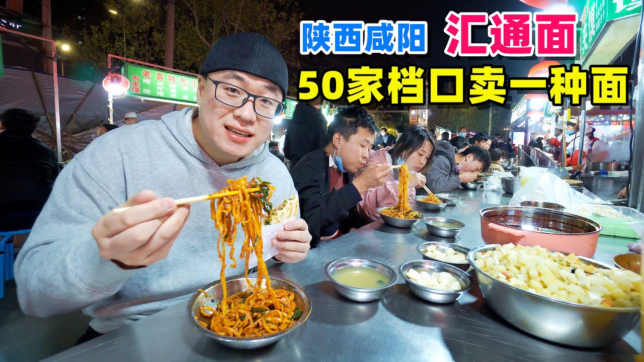 在距離西安25公里的鹹陽,有一個專賣匯通面的夜市,幾十家檔口全都賣一種麵條,但是每家都擠滿食客,誰都不影響誰的生意。大勺乾拌面,滋味酸辣香,麵條筋道有嚼頭,陝西人愛就著蒜吃一碗麵,整個夜市都是吸溜麵條的聲音,瀰漫著醋香,阿星也來吃一大碗。 In Xianyang, 25 kilometers away from Xi’an, there is a night market specializing in Huitong noodle. All 50 stalls all sell one kind of noodle, but each one is full of diners. A large spoon of noodles tastes sour and spicy, and the noodle is chewy. Shaanxi people love to eat a bowl of noodle with garlic. The whole night market is filled with the sound of noodle, which is filled with vinegar,and Axing also comes to eat a large bowl.