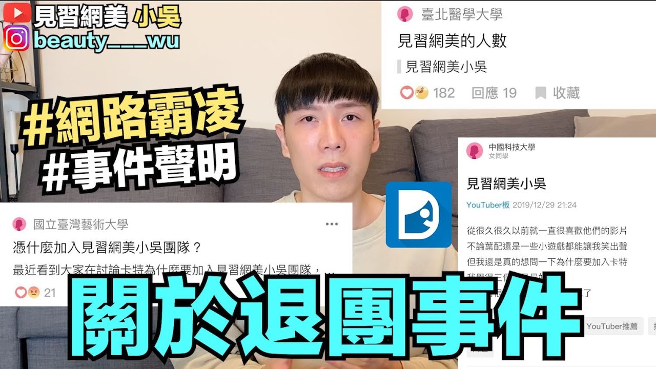 Share Facebook Twitter LinkedIn Pinterest Email 關於Dcard上的討論聲明這支影片剪得很趕…. 但希望大家都能重視網路留言的影響力我們不會讓任何人退出可以1.5倍速看事件始末,謝謝。 #網路霸凌#Dcard #退團#聲明 source 小吳憑什麼加入見習網美小吳網路霸凌事件回覆及聲明Dcard