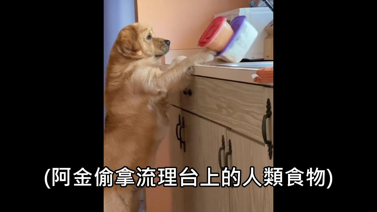 黃金獵犬偷拿流理台上的人類被主人抓包卻不願放掉嘴裡的食物英文字幕