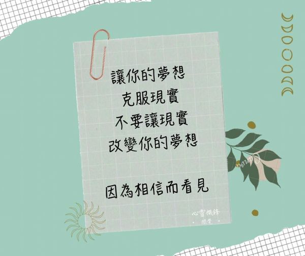 Share Facebook Twitter LinkedIn Pinterest Email 2022.0831 #相信 #夢想 讓你的夢想克服現實, 不要讓現實改變你的夢想。 因為相信而看見 #心靈機鋒 #誾覺 閱讀更多