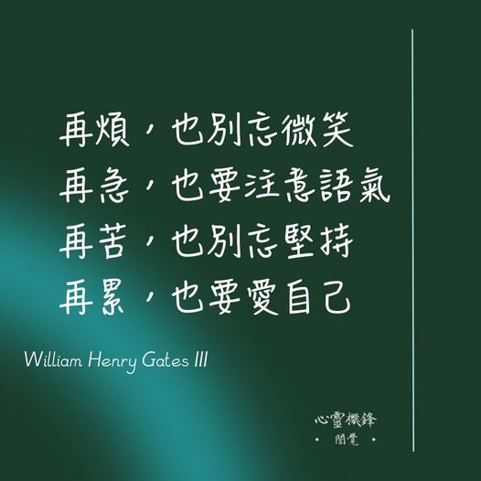 Share Facebook Twitter LinkedIn Pinterest Email 2022.0902 #愛自己 再煩,也別忘微笑; 再急,也要注意語氣; 再苦,也別忘堅持; 再累,也要愛自己。 -William Henry Gates III #心靈機鋒 #誾覺 閱讀更多