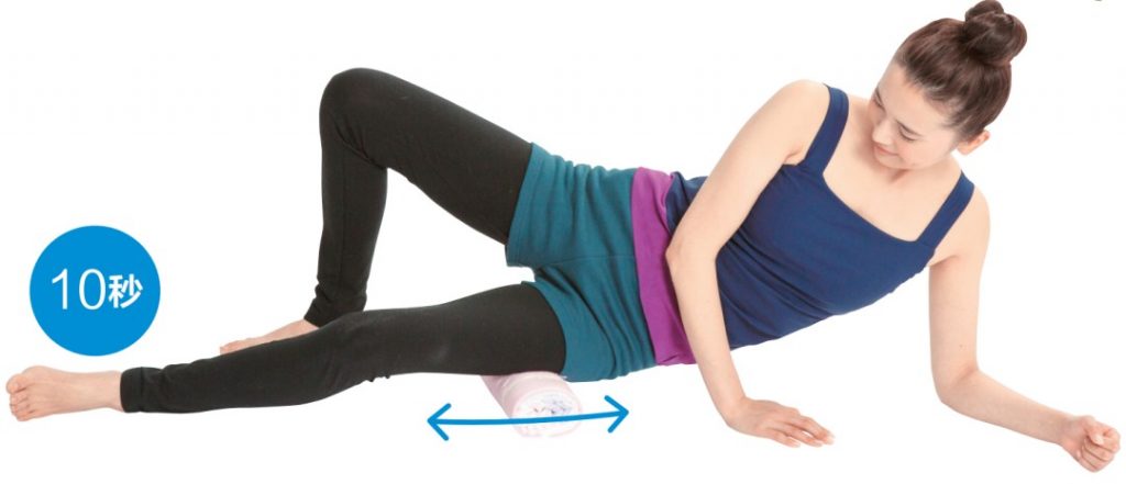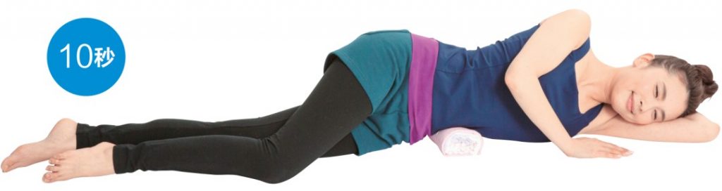 毛巾卷放在左邊小腿外側。 腰部稍微抬起來,邊滾動邊按壓拉伸。