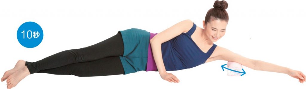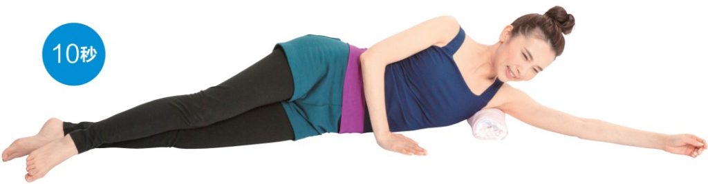 將毛巾卷移動到左腋下,利用體重進行按壓拉伸。