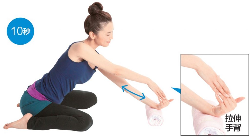 6、按壓拉伸前臂外側的筋膜左手掌心朝上,手腕放在毛巾卷上。 用右手拉左手直到手腕處,慢慢按壓拉伸。