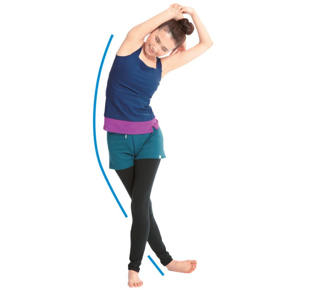 這樣可以感覺到右腿向後轉交叉下半身舉起雙臂。 用左手按壓右胳膊肘,上體向左傾斜。 這時應該能感覺到從右腿外側到腋下被拉伸。