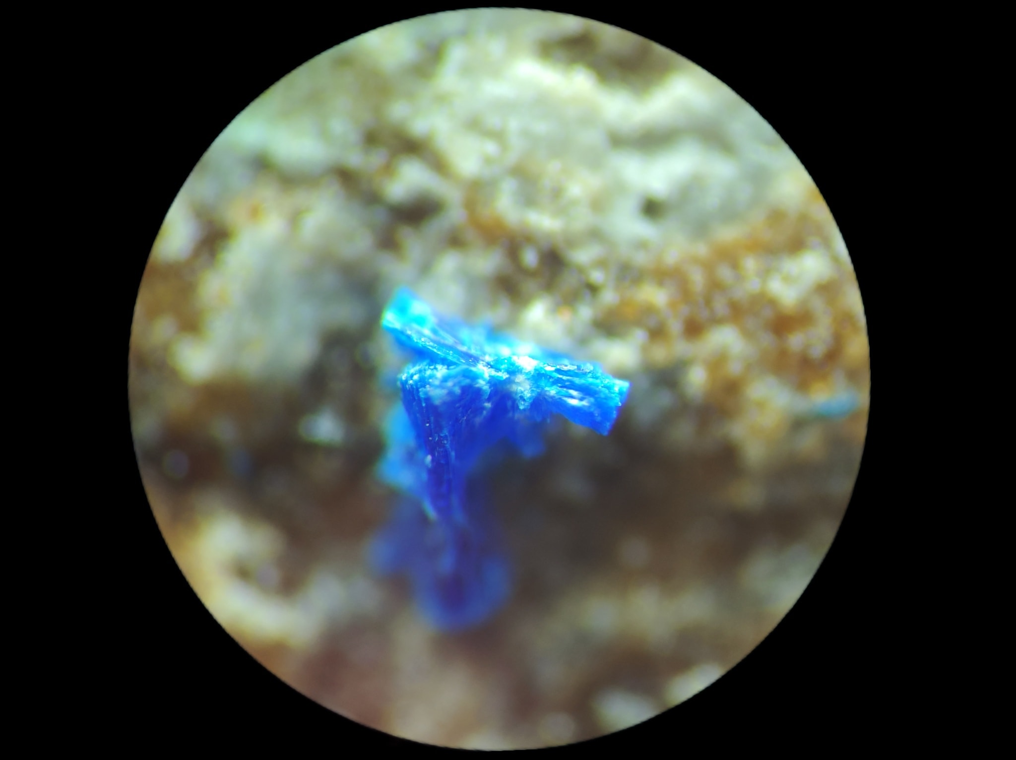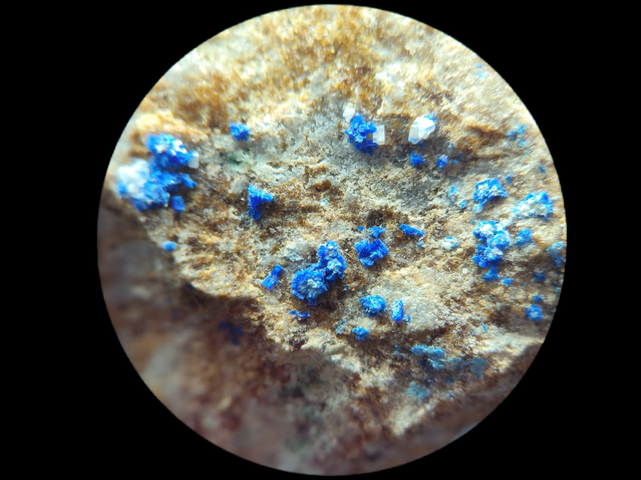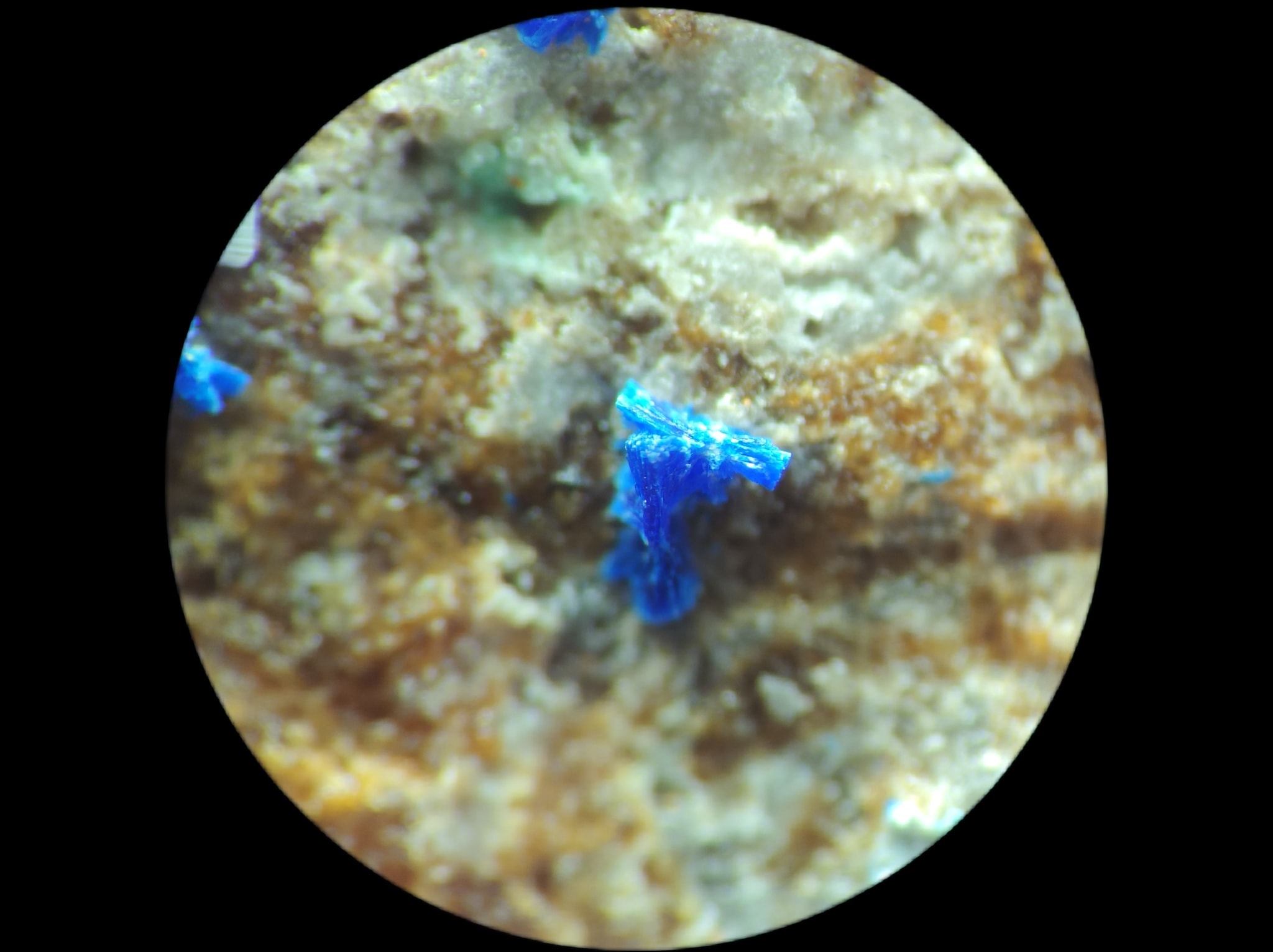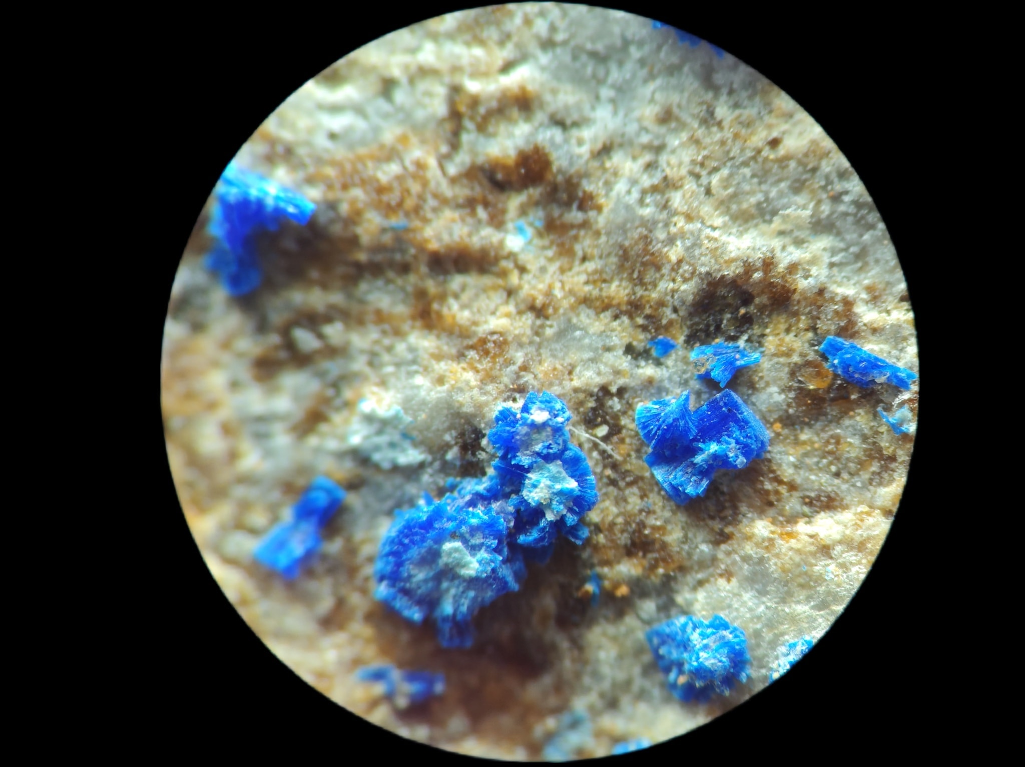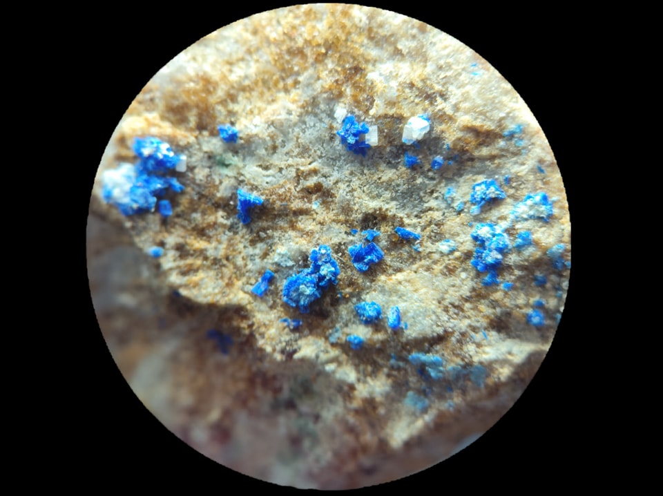 Share Facebook Twitter LinkedIn Pinterest Email 放大觀察認真檢視一下藍色一點一點的是水矽銅鈣石Kinoite,可見微稜柱狀與放射狀晶體。 化學組成:SiO2 36.97%, CuO 32.63%, CaO 23.01%, H2O 7.39%。 多色性:強,Np=淺綠藍色,Nm=藍色,Ng=深藍色 鮮豔的藍色一點都不遜色於藍色小妖藍方石和藍色鈷尖晶。 閱讀更多