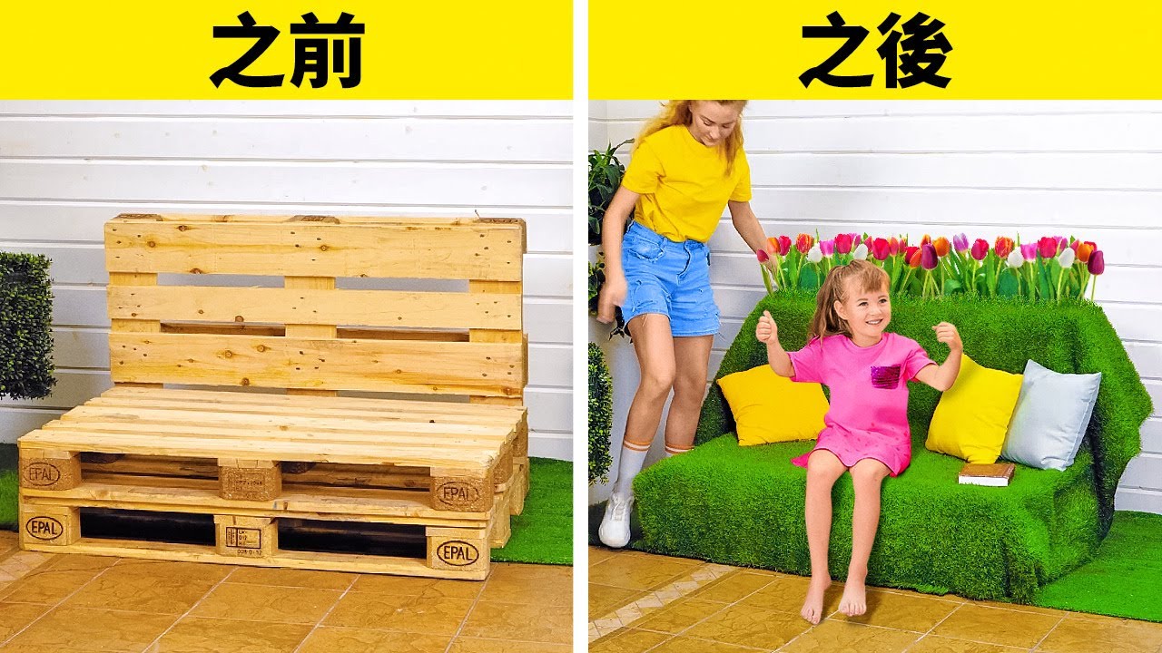 嗨,各位手工愛好者們 🙂 如果你一直在考慮升級你的後院,那麼這個影片很適合你哦! 我們將向你展示不同的家居裝飾和後院手工,讓你的家變的更溫馨。首先,我們將向你展示如何用木托盤製作可愛的沙發。我們還將與你分享另一個沙發創意: 這個可以用兩把椅子製作哦。