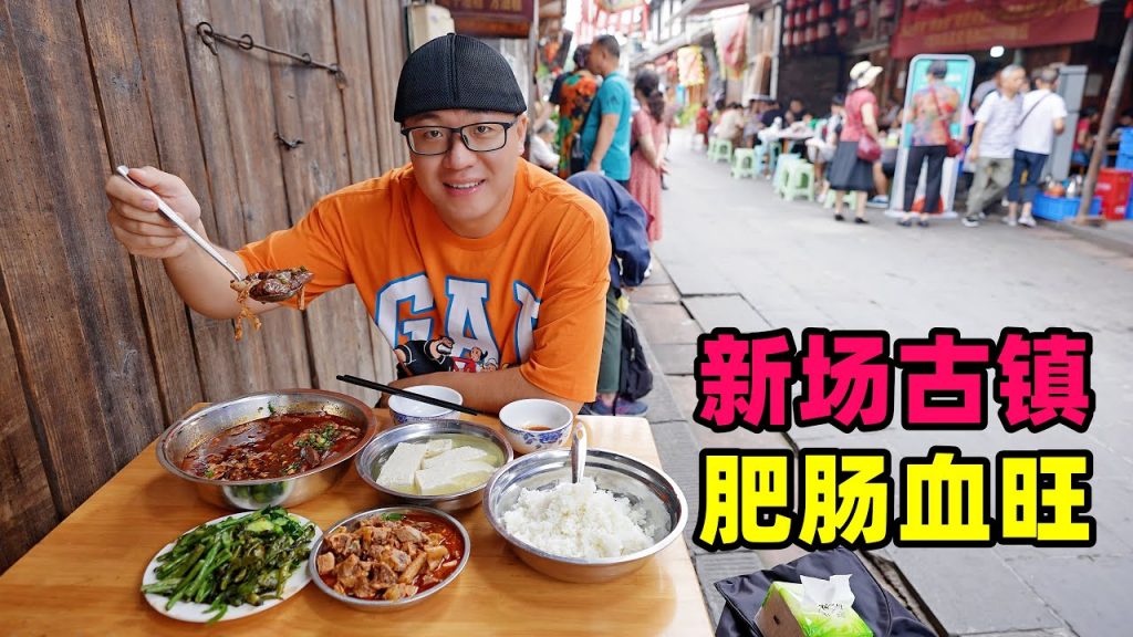 新場古鎮是成都周邊的一個人氣小鎮,這裡有一個美食很有名,是來到四川大邑必須品嚐的,就是肥腸血旺。小鎮老店用柴火大鍋燉煮新鮮的豬血塊,骨湯加肥腸慢慢煨煮的血旺又嫩又滑,是紅油麻辣的川味。同樣很嫩的豆花可以蘸醬拌米飯,麻辣雞塊也是鮮香入味,阿星逛古鎮吃美食。 Xinchang Ancient Town is a popular town around Chengdu. There is a famous food here. It is a must-try when you come to Dayi, Sichuan. It is Feichang Xuewang. The old restuarant in the town uses a firewood cauldron to simmer fresh pig blood clots. The bone broth and fat intestines are slowly simmered. The blood is tender and smooth. It is a spicy Sichuan flavor with red oil. The same tender Douhua can be dipped in sauce and mixed with rice, and the spicy chicken nuggets are also delicious. Axing went to the ancient town to eat delicious food.