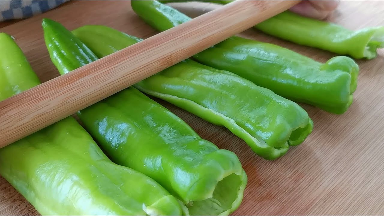 For English speaking watchers, I am pretty sure those peppers are called Anaheim Peppers in English. That’s what they resemble to me, and if they are not, I imagine Anaheim peppers would lend nicely to this! (For those without an asian grocer in their area)