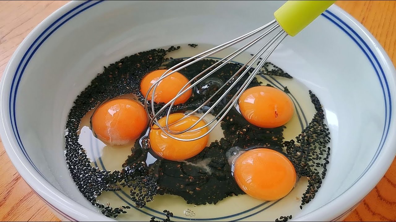 1. Add appropriate amount of cooked sesame seeds to the bowl, then add 5 eggs, 4 grams of yeast powder, 1 spoonful of sugar, 3 grams of salt, and mix well;