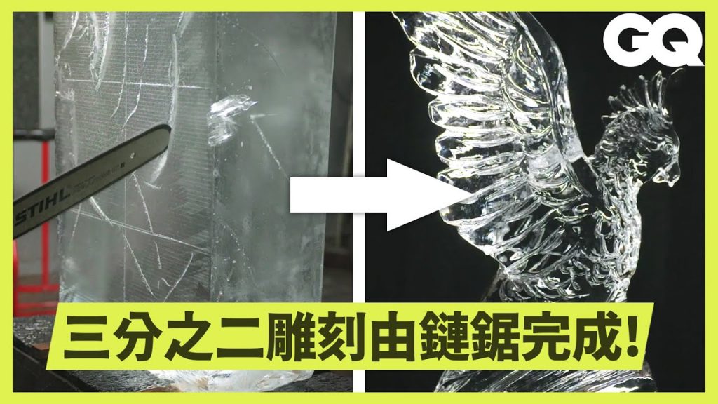與冰雕大師岡本慎太郎一起走進他的工作室,觀看他使用鎬、鑿子、電鋸等工具一步步將200磅重的冰塊變成一座令人驚嘆的鳳頭鸚鵡。