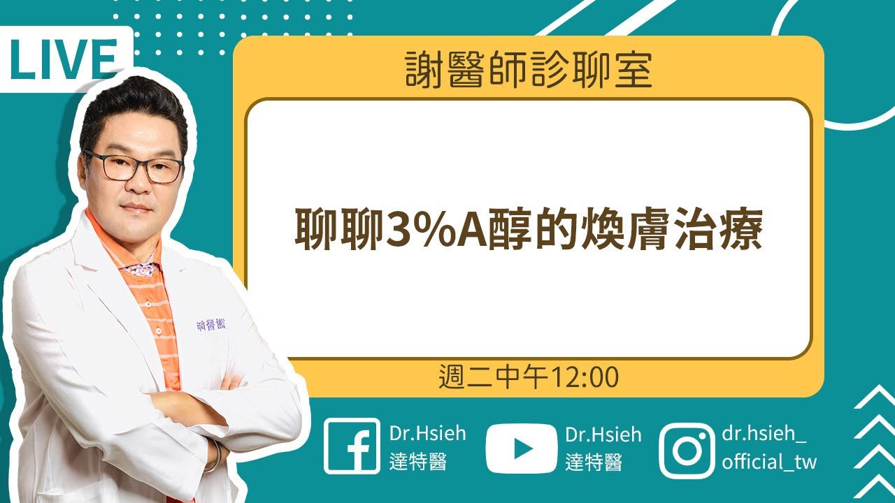 A醇保養成分有改善皮膚老化功效,但A醇功效你真的夠了解嗎?這些「紅癢熱」該如何解決皮膚老化問題? #A醇副作用有好多,到底有沒溫和抗老保養品成分或居家煥膚的抗老方式,解決老化肌,維持年輕時的樣貌呢?皮膚外觀開始老化,25歲開始青春不再年輕,這是許多人必經一趟抗老旅程。 A醇換膚作用可改善眾多肌膚老化瑕疵,例如:皮膚暗沉粗糙、紫外線的光老化、氧化的皺紋痕跡、痘痘與毛孔粗大問題!越多人選擇#A醇保養成分改善皮膚老化瑕疵。但你知道怎麼透過A醇功效的# A醇換膚作用方式,來達到a醇效果嗎?醫學美容皮膚科,專門透過#3%A醇換膚治療改善#皮膚老化的方法!長期以來,被視為最適合熟齡肌膚,日常凍齡的保養成分:「A醇」、「補骨脂酚」、「膠原蛋白」。本直播就要來探究解析「3% A醇換膚治療」程序與方法,同時揭開凍齡保養成分的迷思,讓你透過A醇成分保養時,減緩A醇副作用,同時用得更放心,讓臉部持續超高凍齡力、保持青春透亮光✨✨ 👉達特醫的皮膚老化保養品項: 💜A醇產品:https://reurl.cc/DX974Q 💜補骨脂酚產品:https://reurl.cc/qZd2V0 #皮膚老化#A醇換膚#膠原蛋白#老化#皮膚鬆弛#臉部下垂▾▾▾ 更多資訊請展開▾▾▾ ✨相關文章資訊✨ ✨A醇知識:https://reurl.cc/Z1OgmQ ✨A醇功效:https://reurl.cc/qZd2ER ✨歡迎加入✨ 🔜FB:https://www.facebook.com/drhsieh2007 🔜IG:https://www.instagram.com/dr.hsieh_official_tw/ 🔜 LINE:https://lin.ee/kg3KNms 🎬謝醫師診聊室:每週二臉書+Youtube頻道. live直播聊天.肌膚問題諮詢謝醫師。 ✨相關資訊|了解保養使用/ 產品搭配/ 肌膚諮詢✨ 🔜歡迎到我們的官網:https://www.dr-hsieh.com/ 🔜產品膚況解析:https://reurl.cc/qO6xYn 🔜成分知識文章:https://reurl.cc/Gx58V3 🔜危肌知識文章:https://reurl.cc/X470Lg