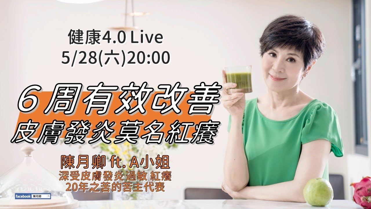 今天邀請深受皮膚發炎、過敏紅癢20年之苦的苦主代表A小姐現身分享她拿自己做實驗,戒掉飲食中的”這個”東西,竟然在6週內有效改善脂漏性皮膚炎、痘痘、粉刺、頭皮屑、皮膚莫名紅癢等問題,連睡眠問題都改善了!! 說不定你也適用?! 👉直播食譜整理在這裡↘https://lihi1.com/p124G #無麩質飲食#減法飲食#抗過敏飲食#健康4點0直播🍽示範食譜: #抗過敏綠拿鐵#抗敏潤肺助眠湯#去濕食譜👍正版Vitamix調理機↘https://lihi1.com/U2Nq0 👍北鼎粉漾壼↘https://lihi1.com/quWEc ⚠️本人沒有推薦任何低價出清的絞肉機/料理機、桑椹產品、青X柳茶、減肥減糖產品、烤箱、鍋具、苦茶油、無花果、睡眠噴霧等等⚠️ 🔧片中使用工具:Vitamix 調理機+ 北鼎粉漾壼Vitamix A系列超跑級調理機↘https://lihi1.com/efe82 北鼎多功能烹煮粉漾壼↘https://lihi1.com/quWEc ===日常保養鮮凍包=== 🥬綠拿鐵+豆穀漿鮮凍包超商店取↘https://lihi1.com/7FIIa 🥬綠拿鐵+豆穀漿鮮凍包宅配到府↘https://lihi1.cc/GHLIk 🥦【一人份的綠拿鐵】 ↘ https://lihi1.cc/ZRGJI ===本人著作可至各大書局購買=== 📕他的癌細胞消失了↘ https://lihi1.com/WCS2L 📕綠拿鐵↘ https://lihi1.com/cTwVD 📕吃對全食物↘ https://lihi1.com/lUYbf 📕從心開始↘ https://lihi1.com/AZdMh ||陳月卿|| FaceBook:www.facebook.com/chenyueching 痞客邦Blog:vitagrace.pixnet.net/blog ⚠️陳月卿特此聲明⚠️WARNING⚠️ 最近多起詐騙盜圖並自行P圖後在網路上下廣告,請大家務必留意,我沒有推薦任何家的低價出清的絞肉機、桑椹產品、青X柳茶、減肥減糖產品、烤箱、鍋具、苦茶油、無花果、睡眠噴霧等等,任何未經合法授權擅自使用本人陳月卿肖像、姓名等相關元素的行為(包括但不限於用於商品實體宣傳、網路宣傳、商家品牌推廣等行為),均是對本人陳月卿肖像權合法權益的嚴重損害,涉及上述行為的相關侵權行為人應立即停止侵權,請立即有效刪除、下架所有相關訊息(包括但不限於網路上之商品宣傳圖片)並公開澄清事實、道歉。本人已留存上述侵權行為之相關證據,並保留法律追訴權,如相關侵權行為人未立即停止侵權行為,本人將進一步採取必要之法律手段維護本人的合法權益。陳月卿特此聲明。