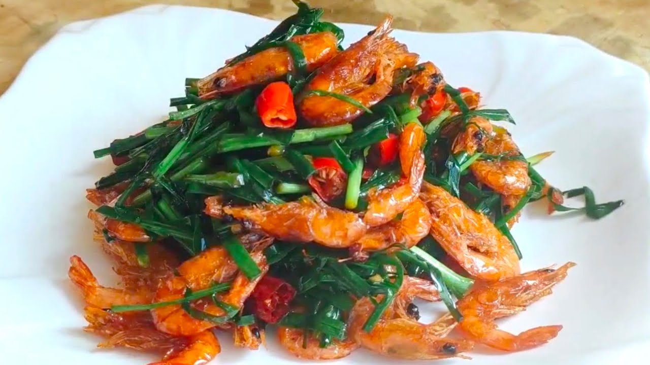 The Chinese food I want to share with you today is Stir-fried River Prawns with Leek.