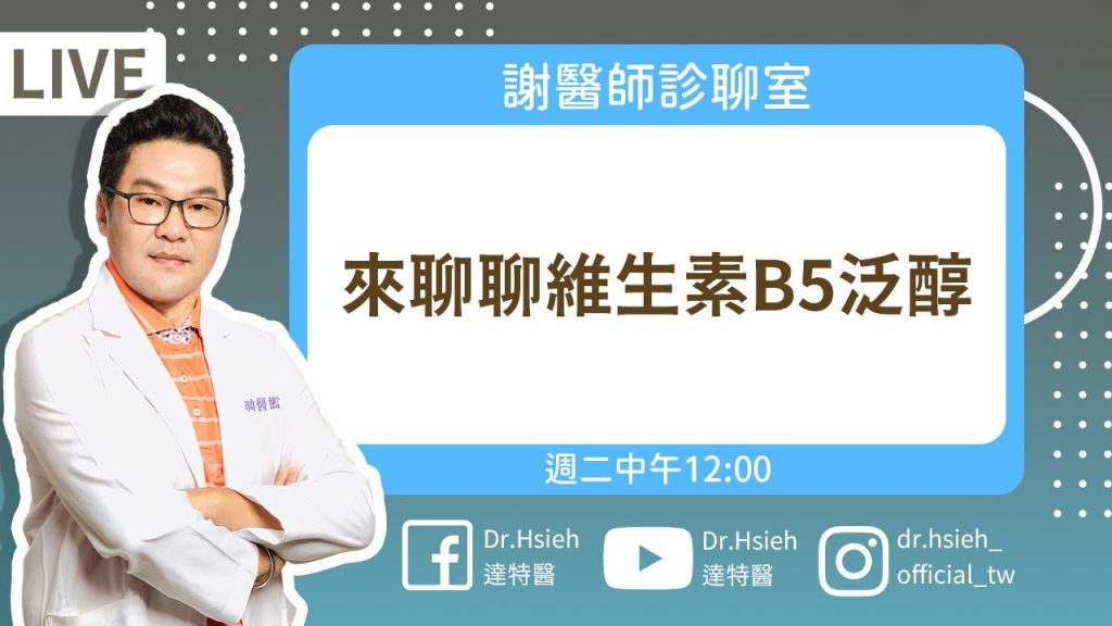臉部保濕步驟不能少!維生素B5(泛醇)可以高效保濕、抗敏弱、抗發炎。 「 #維生素B5功效」對於修復臉上乾燥不適超有感!假如,皮膚突發性乾燥又搔癢情形,先別動手止癢!一旦你直接硬抓、刺激表皮時,不只皮膚留疤機率大幅提升,更是讓淺在紋路有機會更加深層!若還沒將手部消毒,容易導致臉上皮膚嚴重發炎。本直播就要來探究,「維他命B5」如何解除臉部乾燥,和解決肌膚缺水脫屑。讓我們來聊聊「維生素B5」強大保濕威力!揭開這全方位修護的維生素B5功效成分,讓你透過#維生素B5 幫助臉部保濕時,快速補水鎖水、發揮保濕滋潤,快速預防水份流失,重現滋潤緊緻保濕肌。 ✨✨ 👉達特醫的保養品項: 💜維生素B5產品:https://reurl.cc/OE5G4X #維生素B5 #泛醇#臉部保濕#抗老#維他命B5 ▾▾▾ 更多資訊請展開▾▾▾ ✨相關文章資訊✨ ✨維生素B5功效:https://reurl.cc/lZNgZj ✨歡迎加入✨ 🔜FB:https://www.facebook.com/drhsieh2007 🔜IG:https://www.instagram.com/dr.hsieh_official_tw/ 🔜LINE:https://lin.ee/kg3KNms 🎬謝醫師診聊室:每週二臉書+Youtube頻道. live直播聊天.肌膚問題諮詢謝醫師。 ✨相關資訊|了解保養使用/ 產品搭配/ 肌膚諮詢✨ 🔜歡迎到我們的官網:https://www.dr-hsieh.com/ 🔜產品膚況解析:https://reurl.cc/qO6xYn 🔜成分知識文章:https://reurl.cc/Gx58V3 🔜危肌知識文章:https://reurl.cc/X470Lg