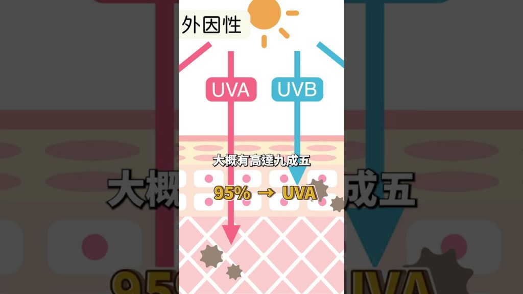 至於外因性的老化,就是紫外線的傷害,別小看紫外線,因為紫外線大約有95%都是UVA這個波長,只有5%是UVB喔!