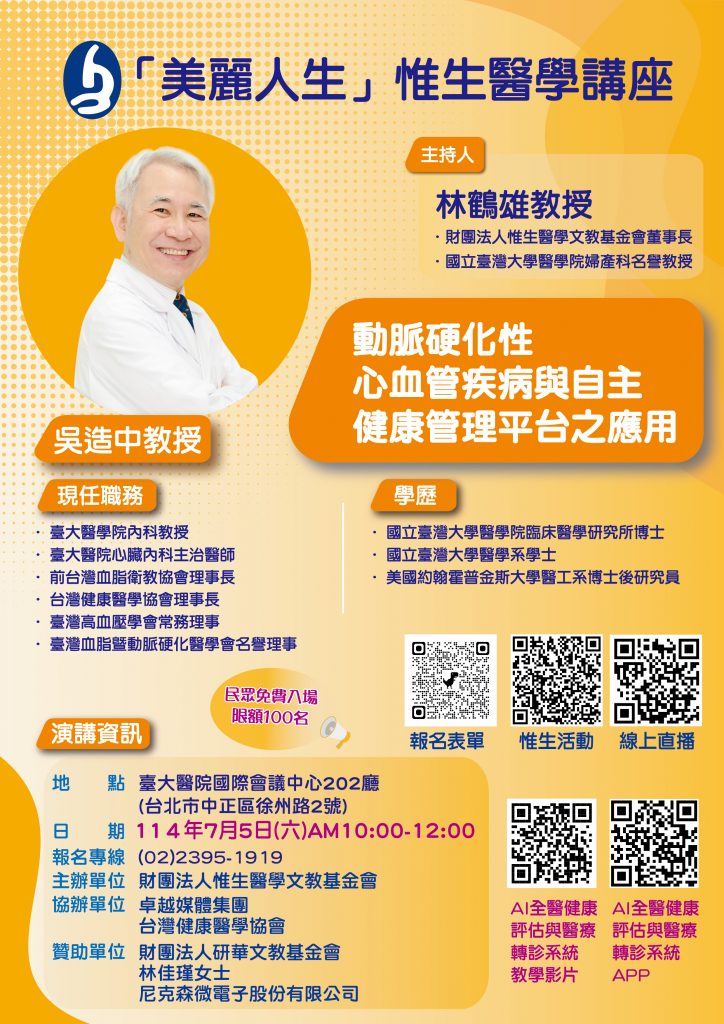 特別感謝本場【美麗人生講座】由財團法人研華文教基金會、林佳瑾女士與尼克森微電子股份有限公司熱情贊助。敬邀大家踴躍參加,一同關注心血管健康,邁向更美好的人生!