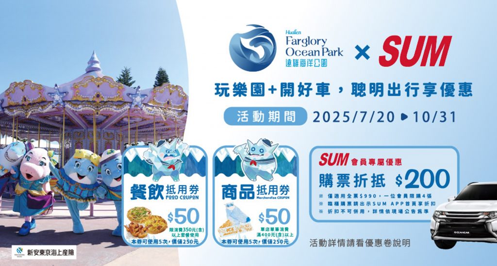 配合夏季出遊旺季「SUM汽車保修聯盟」也特別與「遠雄海洋公園」合作推出專屬福利。7月20日起至10月31日止,凡是SUM會員只要出示SUM APP會員優惠券,即可享有入園門票折扣200元,並加碼園內消費抵用券500元優惠,讓大家輕鬆入園、吃好吃滿、買到開心。