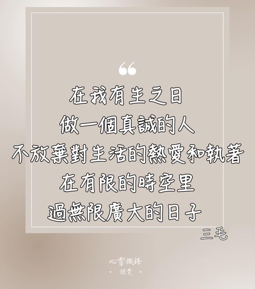 Share Facebook Twitter LinkedIn Pinterest Email 2022.0511 #活著 在我有生之日 做一個真誠的人 不放棄對生活的熱愛和執著 在有限的時空裡 過無限廣大的日子 #三毛 #心靈機鋒 #誾覺 閱讀更多