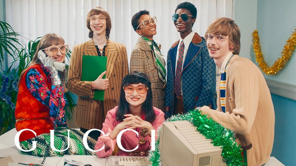 Gucci Gift 的新廣告系列設想了在具有 90 年代復古氛圍的辦公室裡舉行的假日派對。 當時鐘敲響五下時,穿著 Gucci 的同事變成了節日的夜店愛好者。 在加入 conga 系列的間隙,同事們打開了系列中的禮物,包括羊毛 GG 提花圍巾和帽子,以及 GG Marmont 包和 Gucci Tennis 1977 多色金屬亮片運動鞋。