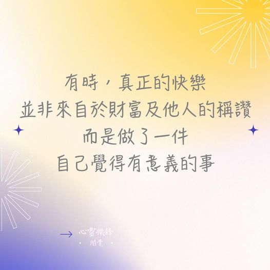 Share Facebook Twitter LinkedIn Pinterest Email 2022.0727 #快樂 有時, 真正的快樂 並非來自於財富及他人的稱讚, 而是 做了一件「自己覺得有意義的事」 #心靈機鋒 #誾覺 閱讀更多
